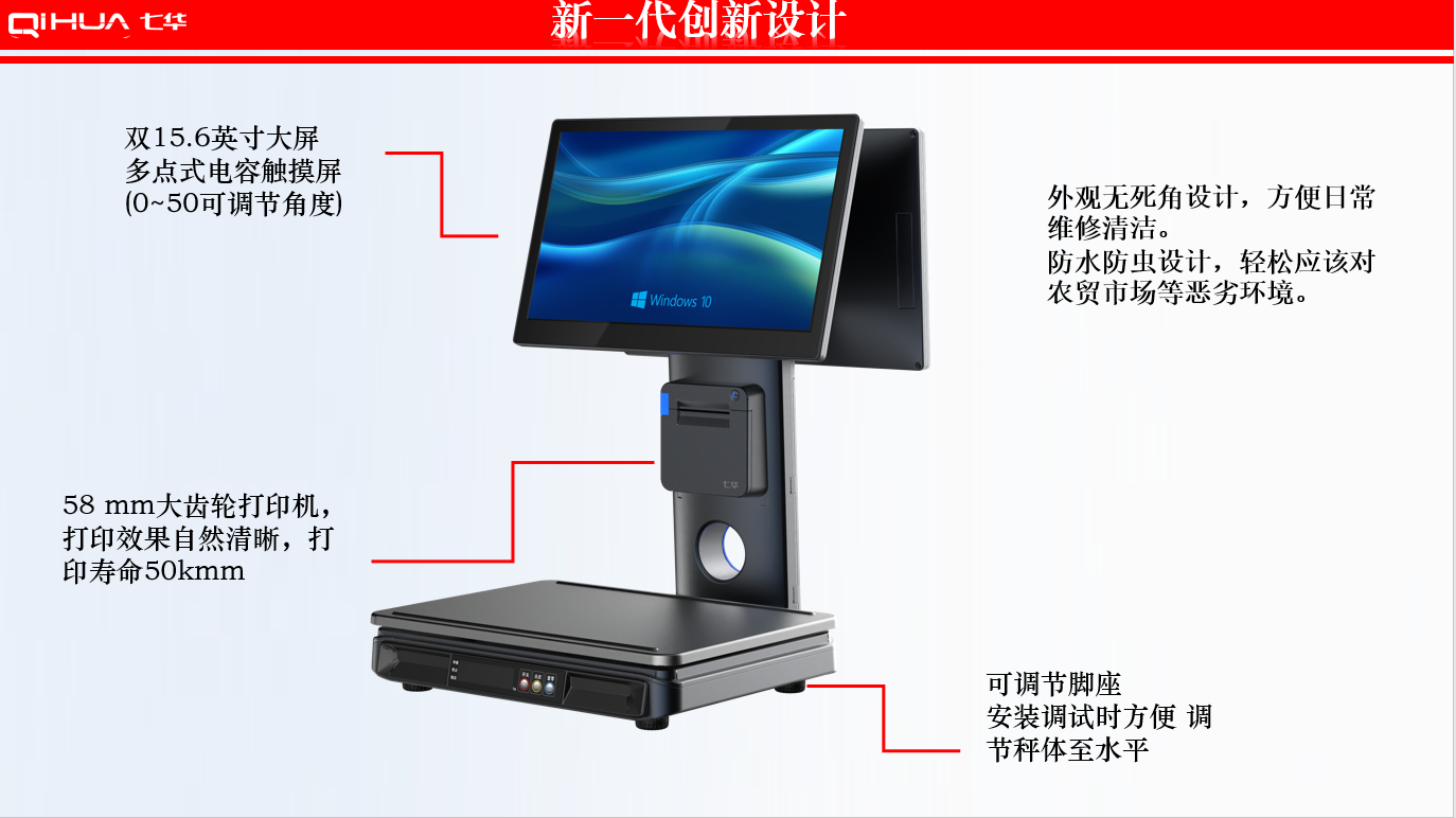 描述:新一代創(chuàng)新設(shè)計,雙15.6英寸大屏,多點式電容觸摸屏可(0~50可調(diào)節(jié)角度)。鋁合金立桿,全新的線倉設(shè)計,輕松藏線,防止線材暴露雜亂。臺面整潔有序。七華自研稱重專利技術(shù),稱重穩(wěn)定、快速;過載保護設(shè)計,設(shè)強度稱重頻率下也能保持穩(wěn)定準確;通過國家計量認證, 支持國內(nèi)各地區(qū)檢驗要求。外觀無死角設(shè)計,方便日常維修清潔。 防水防蟲設(shè)計,輕松應(yīng)該對農(nóng)貿(mào)市場等惡劣環(huán)境。